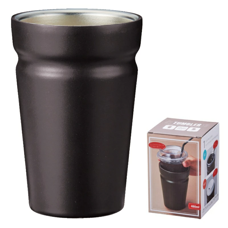 コンビニやコーヒーチェーン店のカップが入る、持ちやすい形状の真空ステンレス製タンブラー。