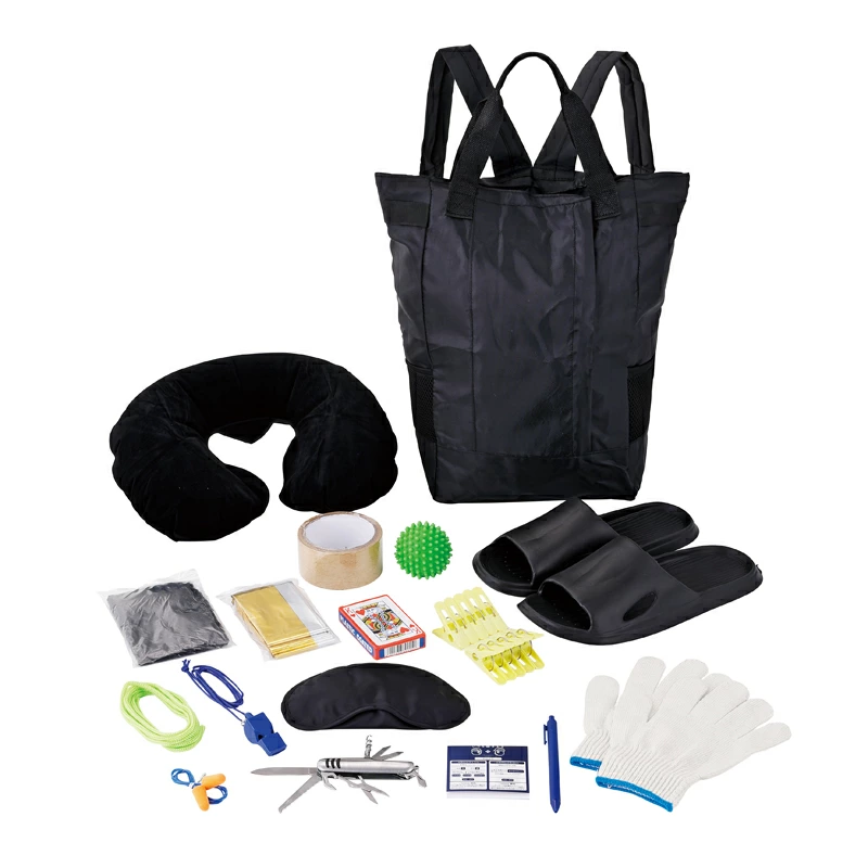 2WAYリュック、エアネックピロー、ガムテープ、リラックスボール、スリッパ、レインコート、アルミブランケット、トランプ、ロープ、洗濯ばさみ10P、軍手、アイマスク、ボールペン、防災メモ、耳栓、ホイッスル、多機能ナイフ